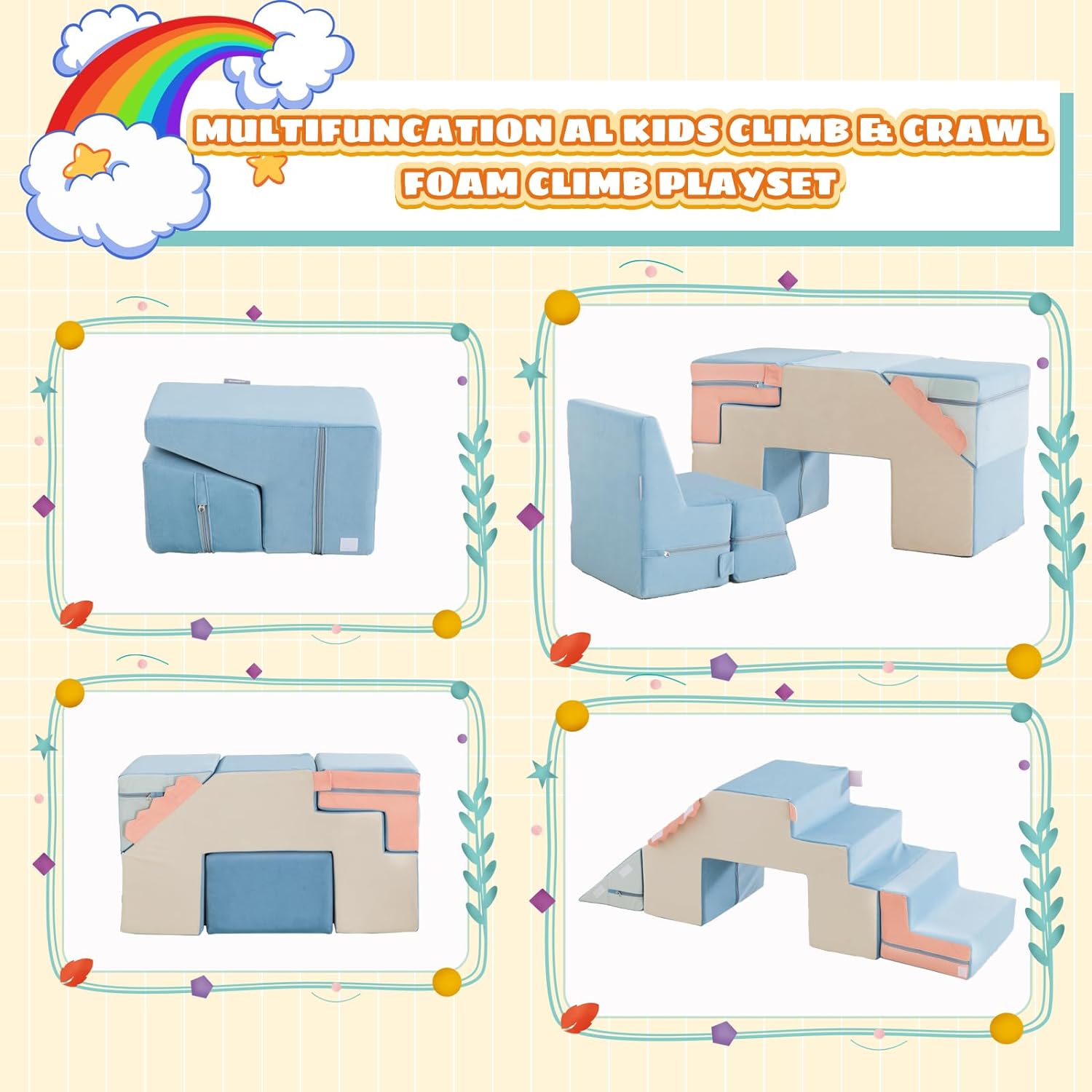 • CULTIVATE CREATIVITY AND IMAGINATION Asweets foam climbing blocks not only encourages kids to use their imagination. but also educates them on how to think creatively. It is not only a super comfortable foam climbing set but also an open-ended toy!