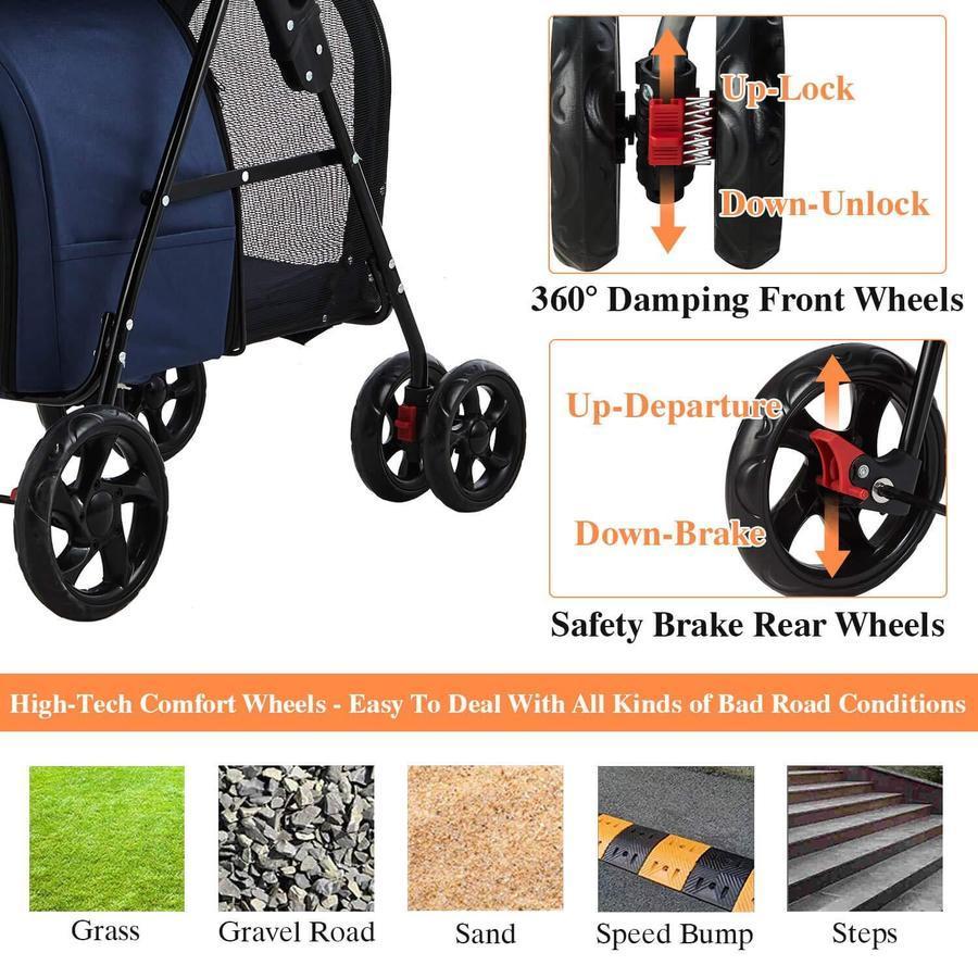 • 42 Double Pet Stroller for 2 Dogs & Cats,4 Wheels Dog Strollers Folding Travel Cat Stroller with Suspension System,Navy Blue